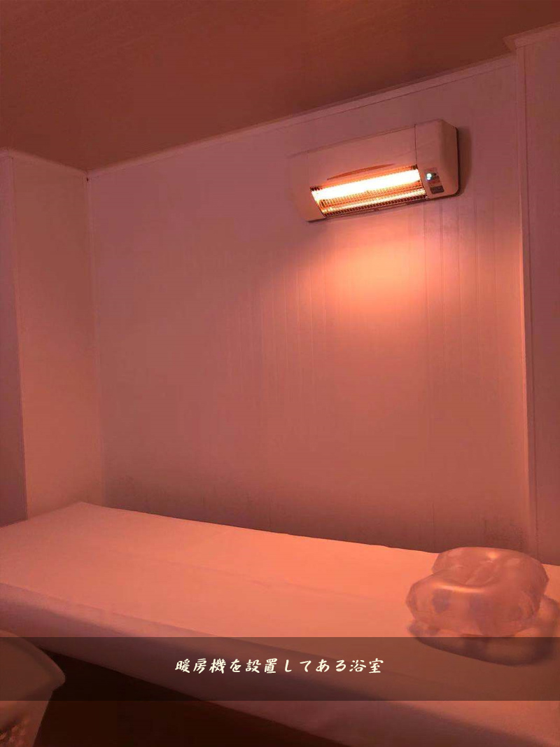 当店のアカスリルームには浴室暖房機と冷風機が設置してあります。電源ONで瞬時に暖まりますので肌寒さがなくなって快適に洗体・アカスリがお楽しみ頂けます。冬は寒いからと躊躇していたお客様も寒さを気にすることなく安心してご利用頂けます。夏も冷風機が使えますので涼しく泡洗体できます。よろしくお願いします。